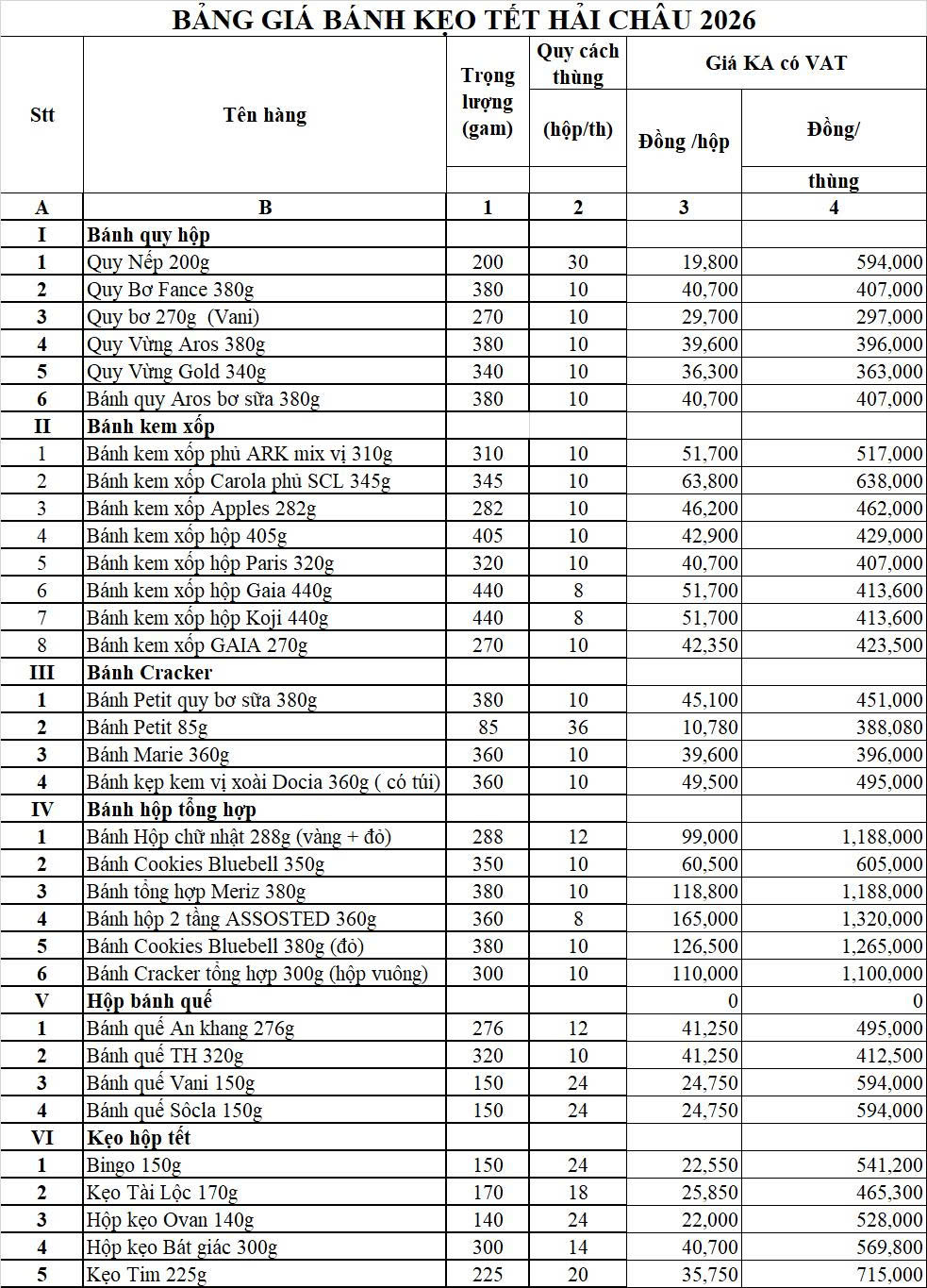 * Bảng giá bánh mứt kẹo tết HẢI CHÂU 2026 (đã có VAT):