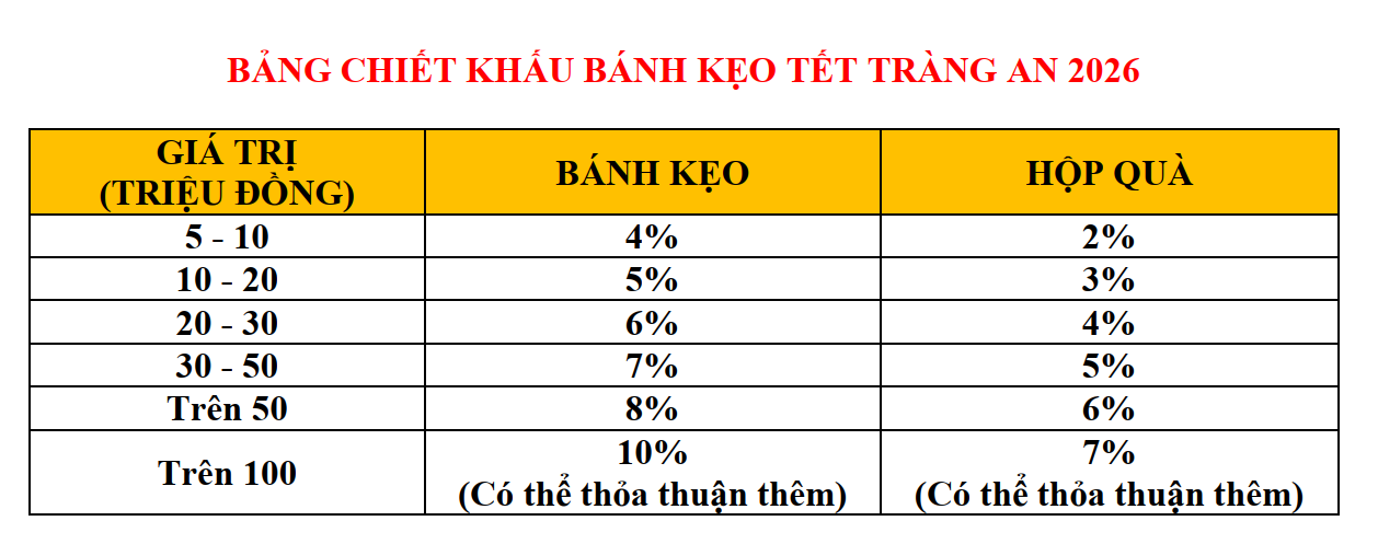 * Bảng chiết khấu bánh kẹo tết TRÀNG AN 2026: